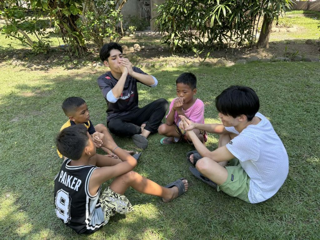 こちらは庭で車座になって「指笛」をこどもたちから教わっているところ。