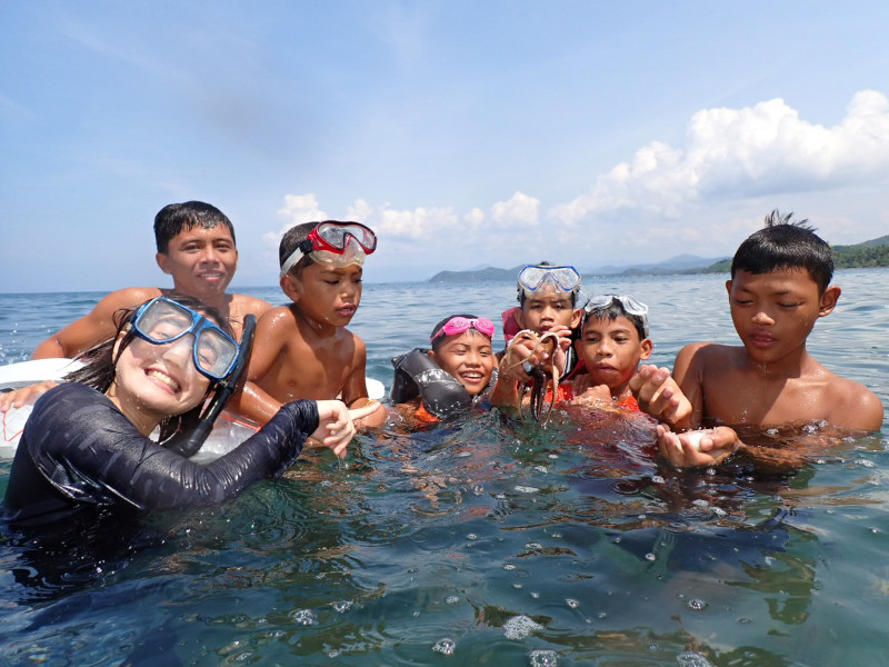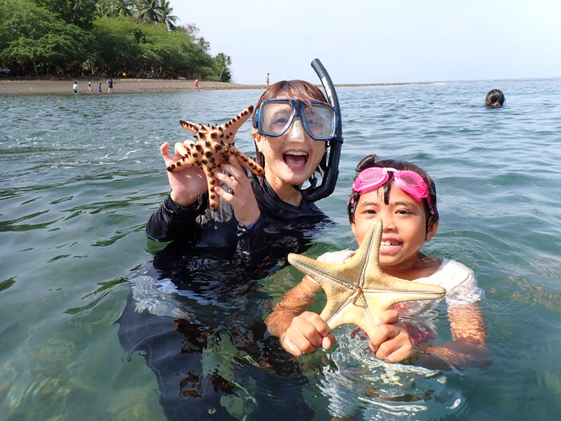 ヤドカリをレースさせたり、タコを獲ったり、魚のいるサンゴ岩の周りで泳いだりと、