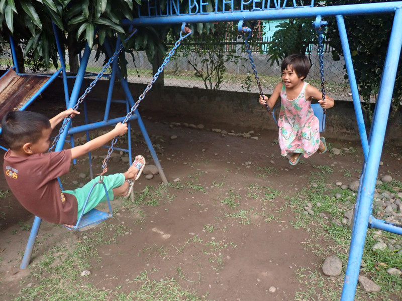 ブランコで遊ぶイージェイとビンビン。「なんでイージェイは後ろ向きなの?」と聞いたら