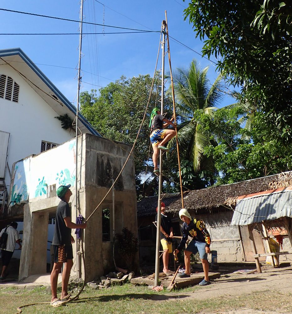 スイスイとそこに登っていきます。柱のてっぺんには滑車がついていて、そこにロープをかけ、