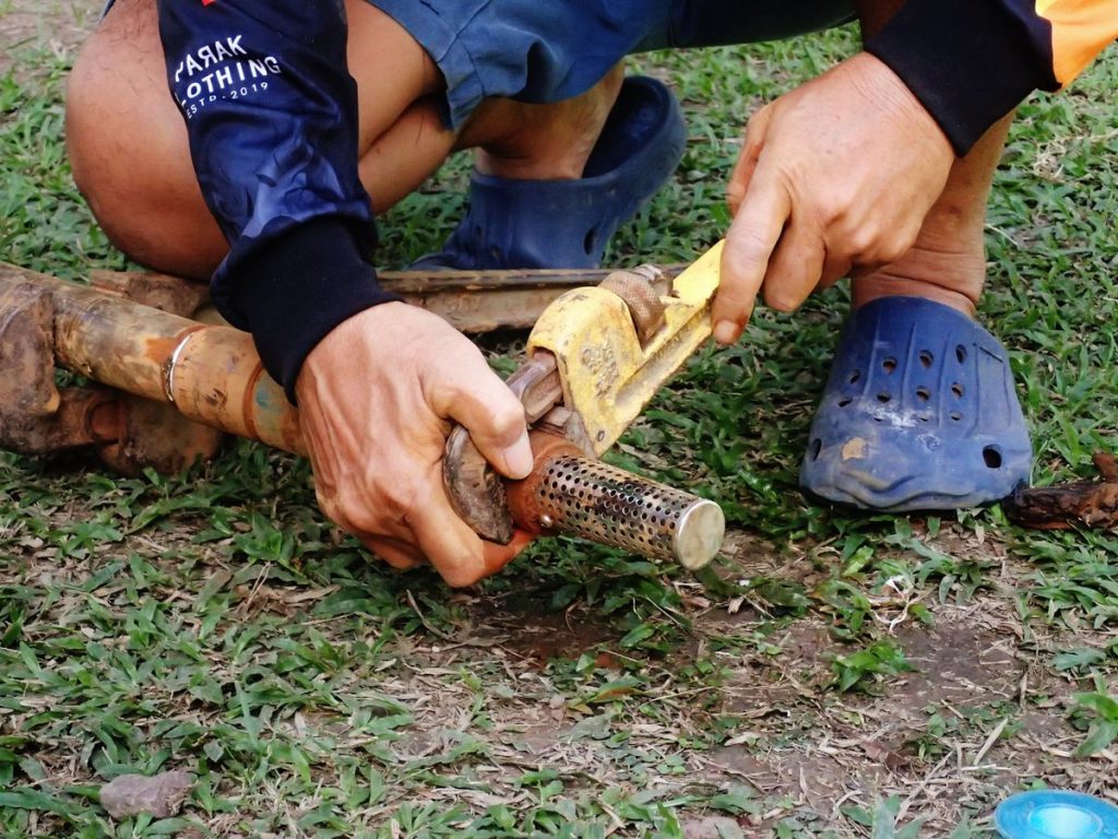 そしてパイプを打ち込みなおしてから、ポンプを再設置。