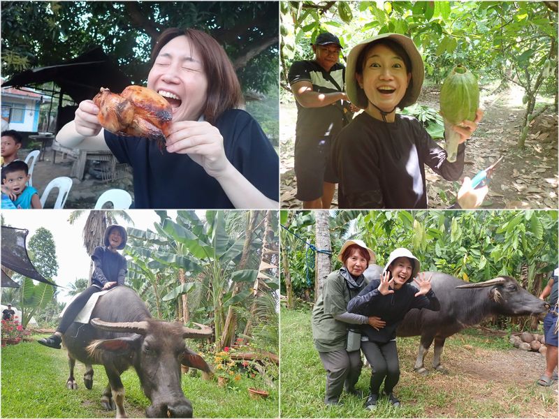 カカオの果肉を食べ比べたり、ヤシの実を収穫して飲んだり、水牛に乗ったり。
