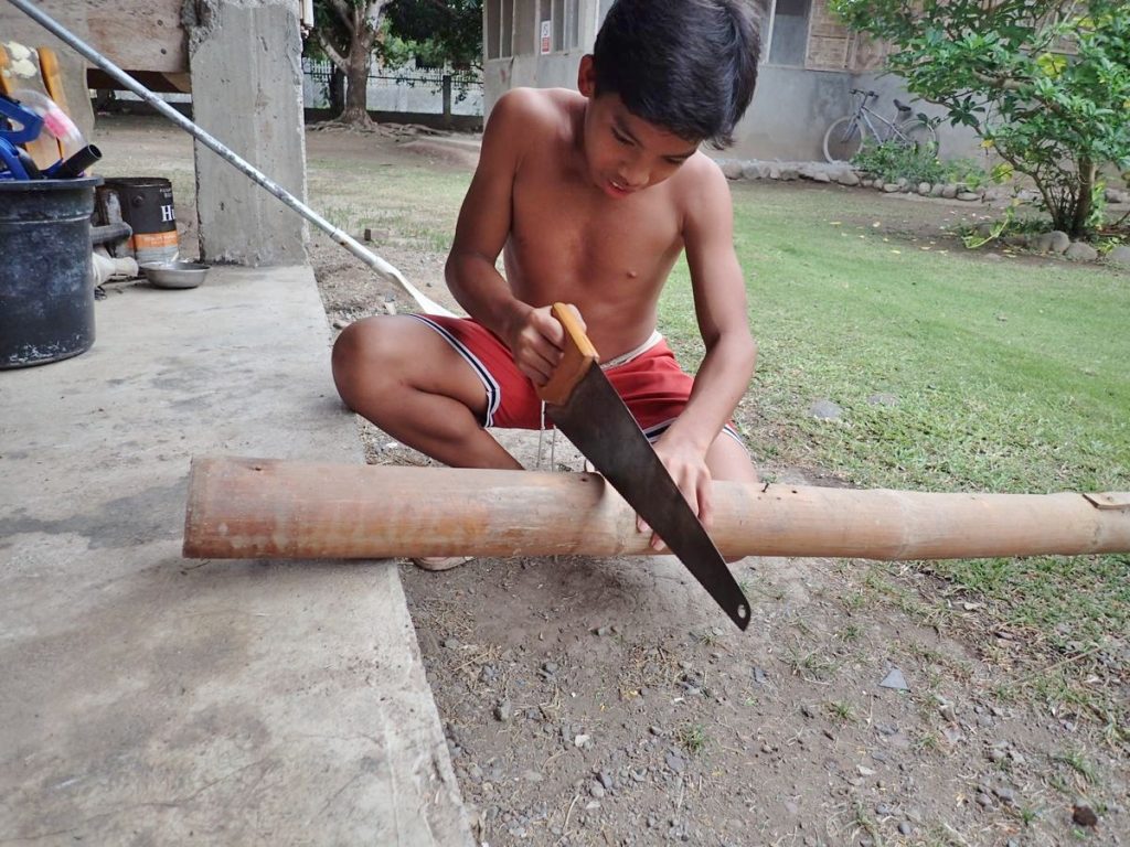 竹を切って、節を活かして物入を作るとのことで、まずは切り出し完了。