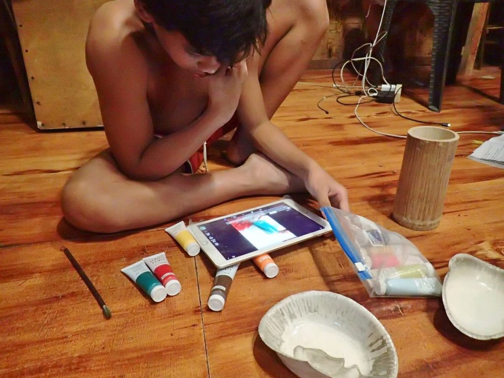 明日、学校に持って行って彩色するとのことなので、アクリル絵の具も貸しました。