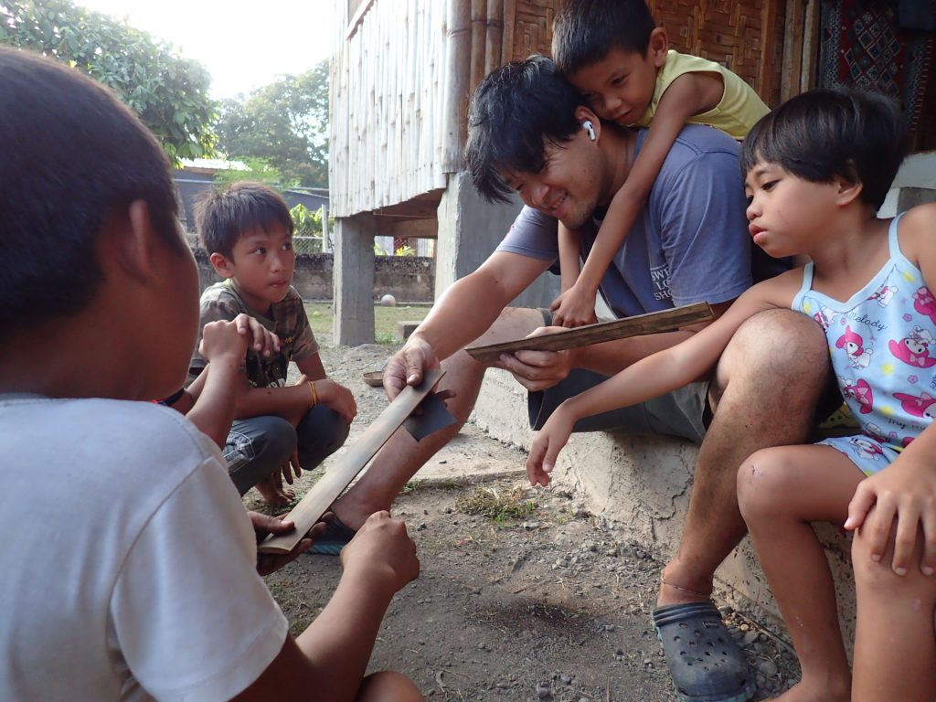 竹の板を炙ってサンドペーパーで削る作業をしていたら、こどもたちが集まってきました。