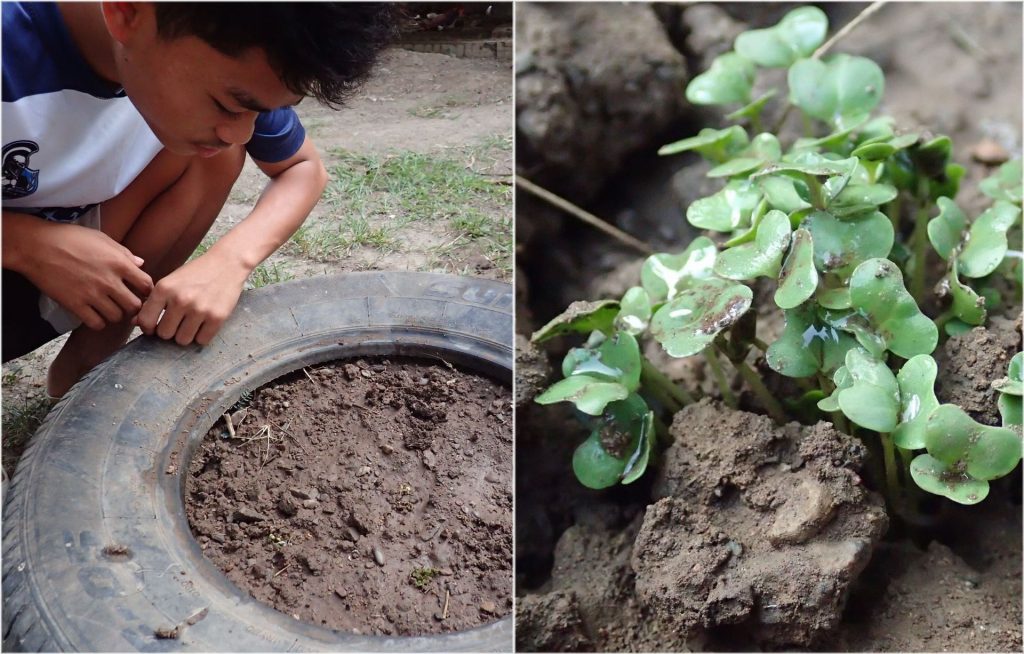 ジャンジャンが古タイヤをプランター代わりにして植えた野菜が芽を出しました。