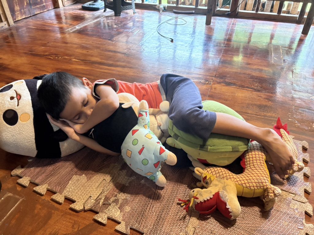 こちらはお昼寝中のイージェイ。お兄ちゃん組に邪魔されて寝れないとのことで、こっちで寝なーと言ったらありったけのぬいぐるみをかき集めて一緒に寝ているところです。可愛すぎる最年少。恐るべし。