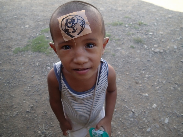 ドラえもんを描いてもらえました。この写真はそれを大喜びでおでこに貼って見せに来たところです。
