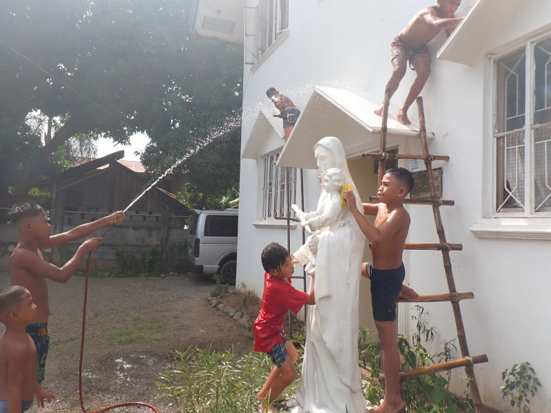 鳩の糞で汚れた建物の外壁や、マリア像をみんなで磨いてます。いい光景ですねえ。