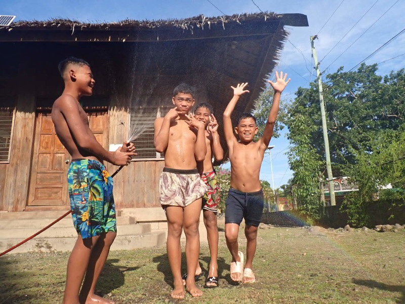 作業の合間にホースで水遊び。「こうやると虹ができる!」と大はしゃぎです。