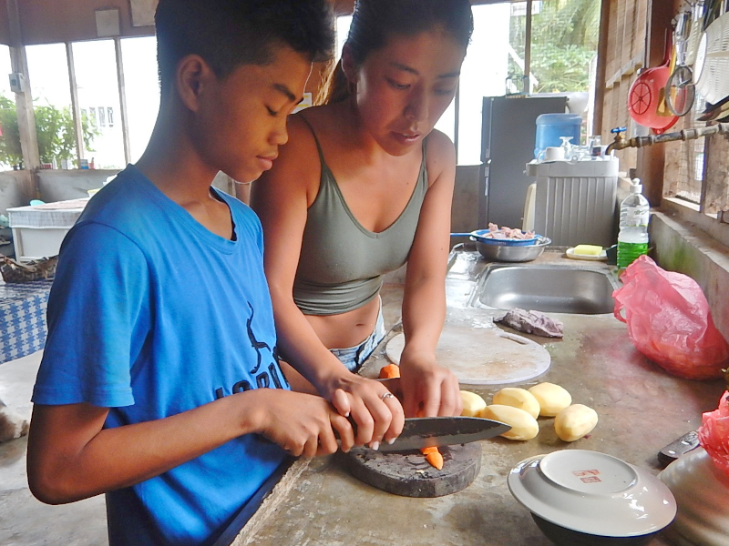 家庭科の先生のアサコさんはフィリピン料理に興味津々。さっそくアルチーさんとジャンジャンに教わりながら、