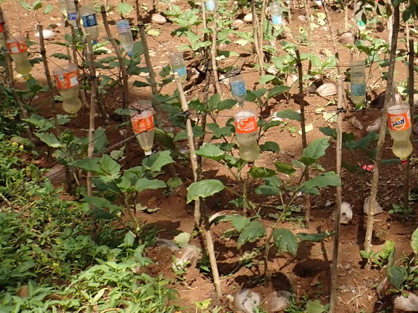 野菜畑を見せてもらったら、なんだかペットボトルがいっぱいぶら下がっていました。