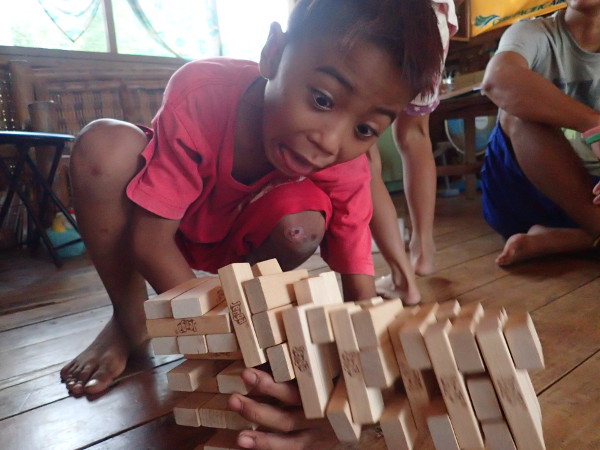 改築で出た大量に出た廃材。こどもたちが何やら作って遊んでいます。