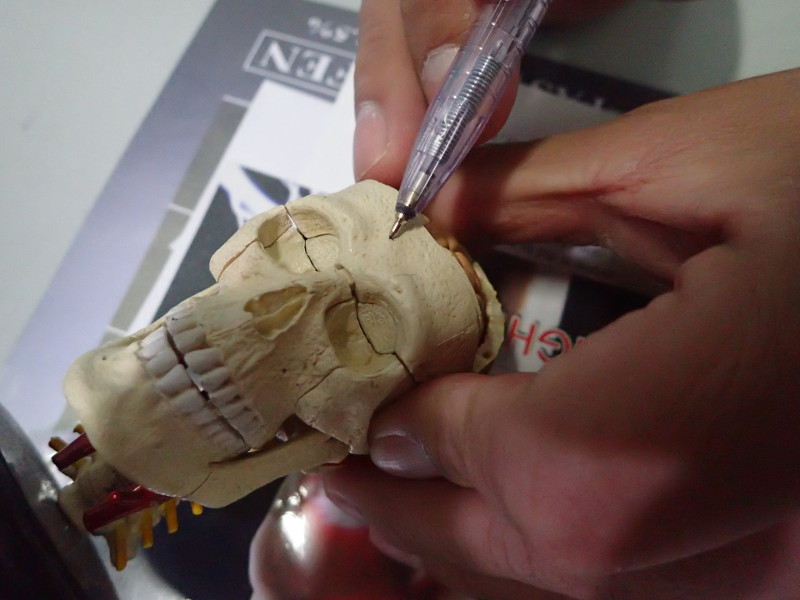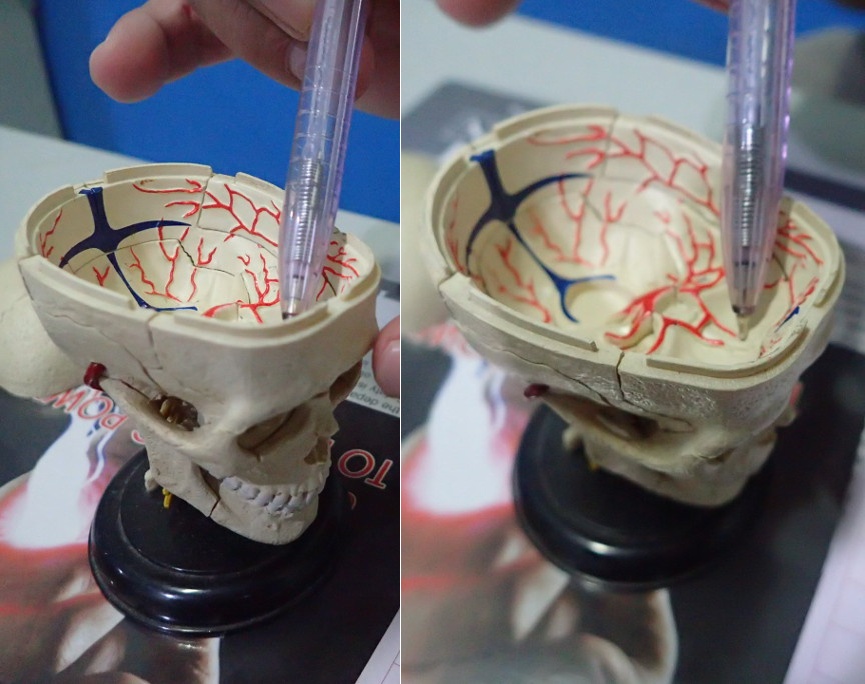 脳を覆っている硬膜の、写真のペンで指示した部分に、2センチくらいの穴が開いているんです。
