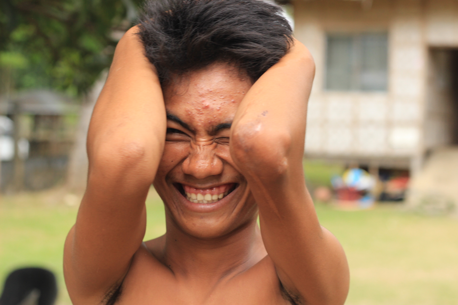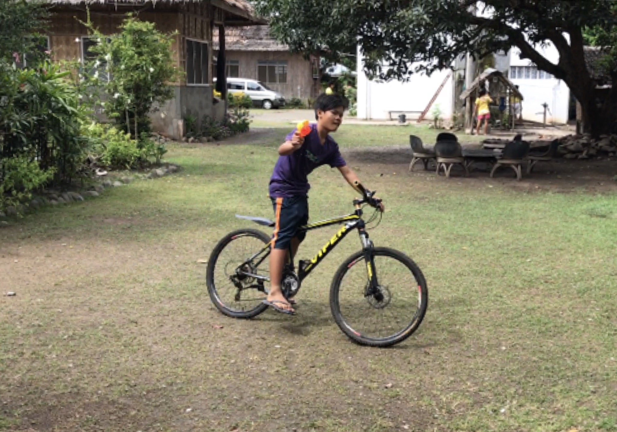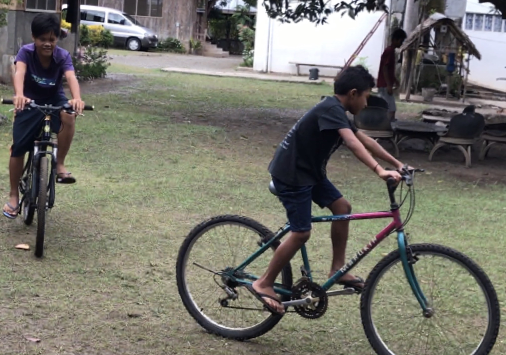 んでもってリッキーがシンさんお手製の竹楽器を演奏するもんだから、近所の子達は自分も遊びたくてウズウズしてきたのでしょうか。中に入ってきて一緒に遊びました!