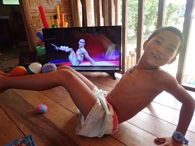 32インチのモニターでサーカス動画を見てジャンジャンが大興奮です。