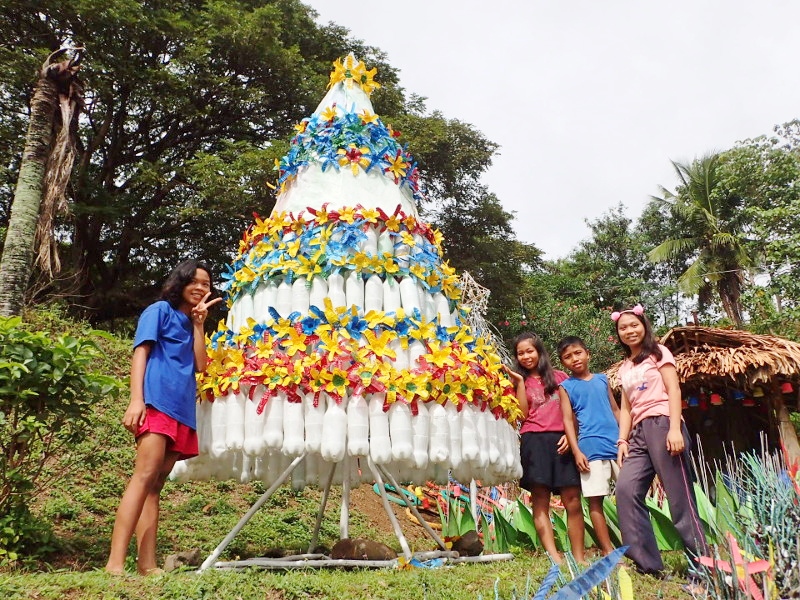 公園のそばには、ペットボトルやビンのフタなどを再利用した大きなクリスマスツリーが飾られていました。