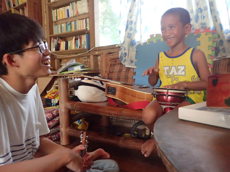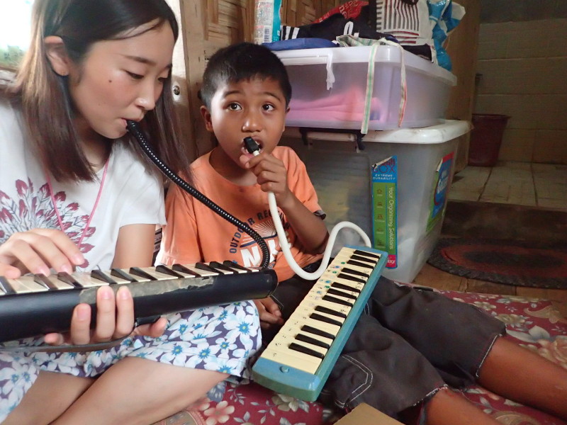 ジェレミーはメグミさんにピアニカを教わっています。ちょうどボランティアスタッフが大勢いるので、
