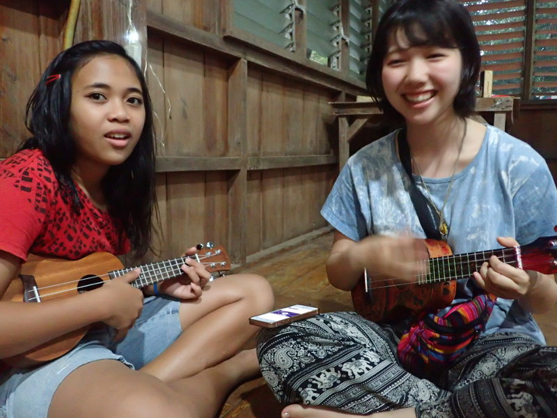 ジョイジョイはサキさんからウクレレを習い中。前にギターを練習していたのでウクレレの覚えも早いです。