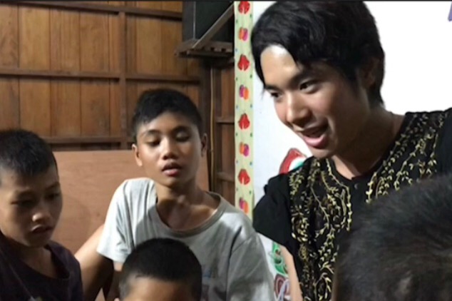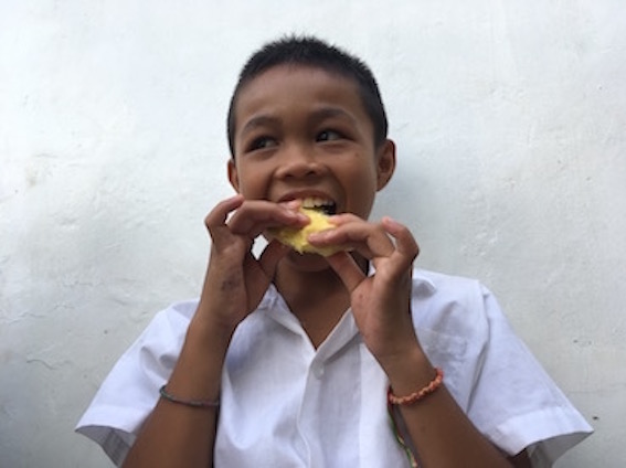 マンゴーを食べているリッキーガマイの腕には、刺繍糸で