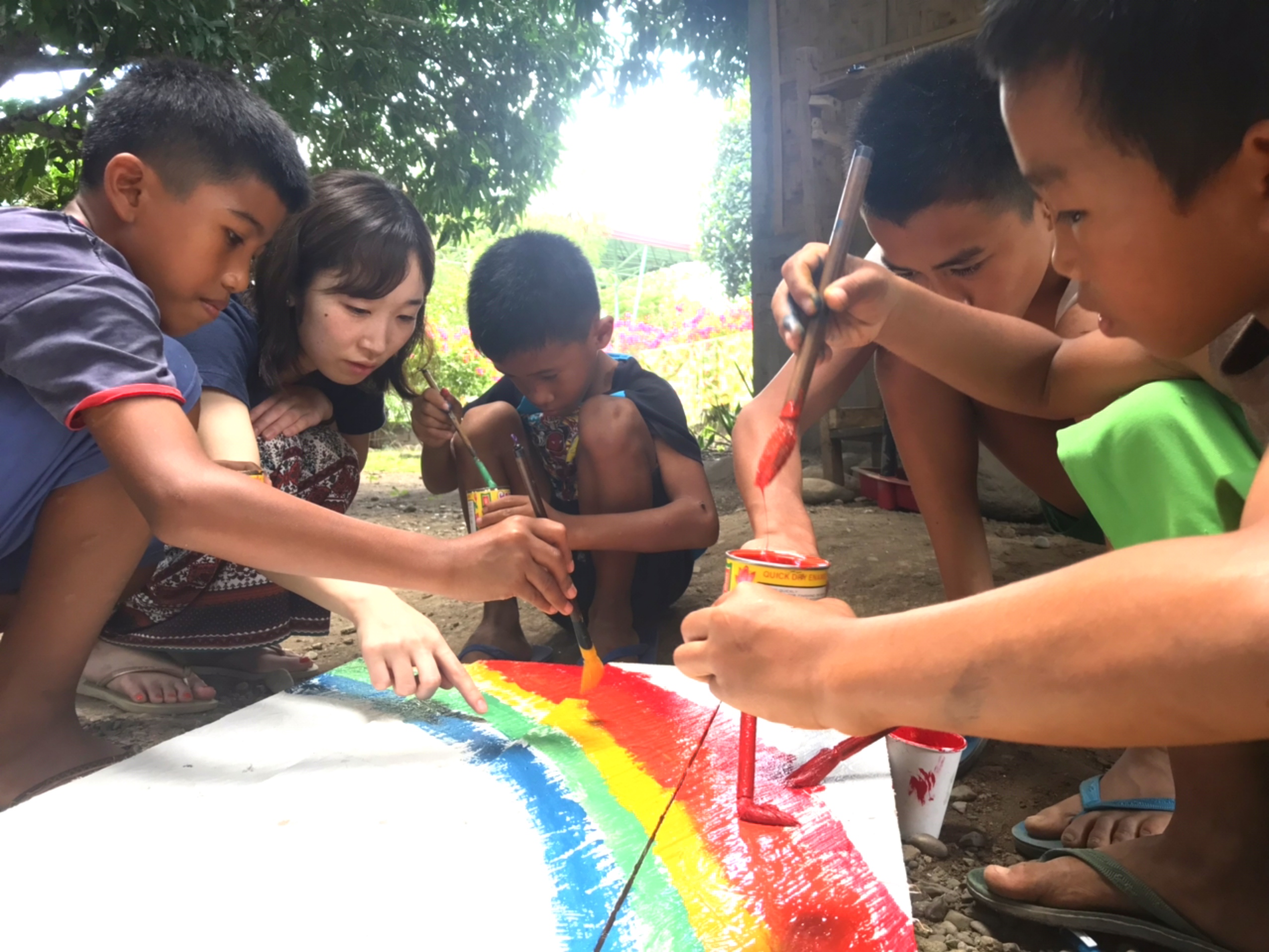 前日の夕方に、空に綺麗な虹がかかったのを皆で見て感動したので、皆の思い出の虹を描きました!