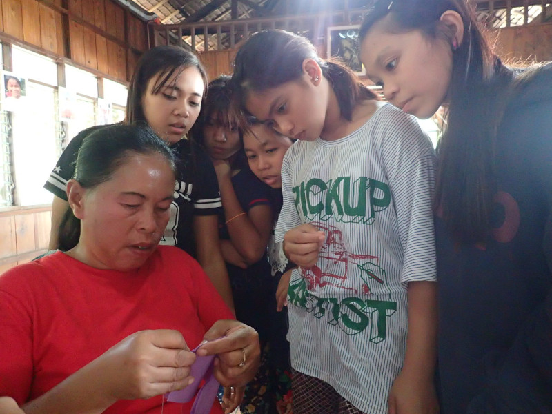 アイダさんの作ったサンプルを元に、スタッフのローサさんが縫い方を女の子たちに伝授。
