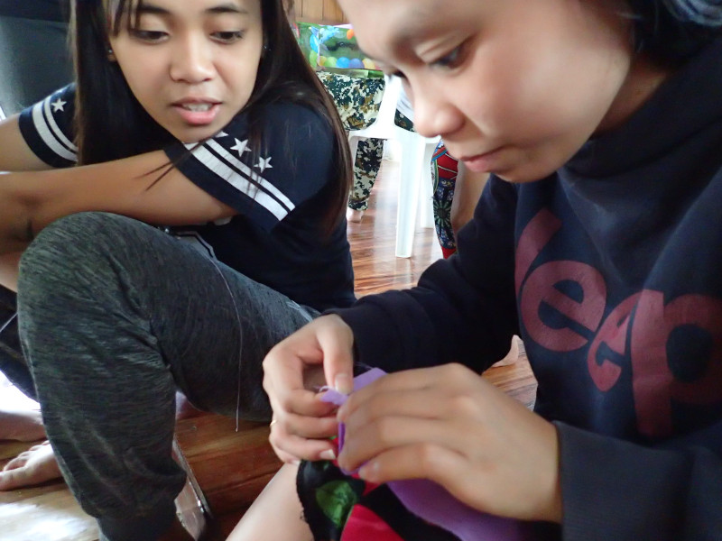 そして女の子たちが見様見真似で1枚ずつ縫っていきます。