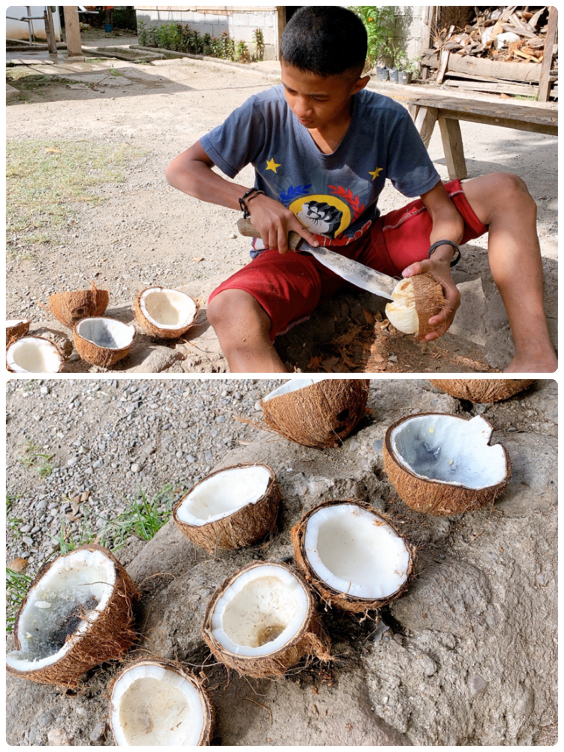 乾いたココナッツをナタで切り、中の実がある部分を残します。シンさんいわくココナッツの丸い部分が花壇になって花を育てるのだとか。