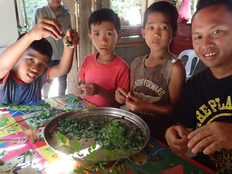 今日の料理担当は男子たち。いつもだと時間のかかる、モリンガの葉を茎から取る作業「ハッグパッ」も、この人数ならあっという間です。