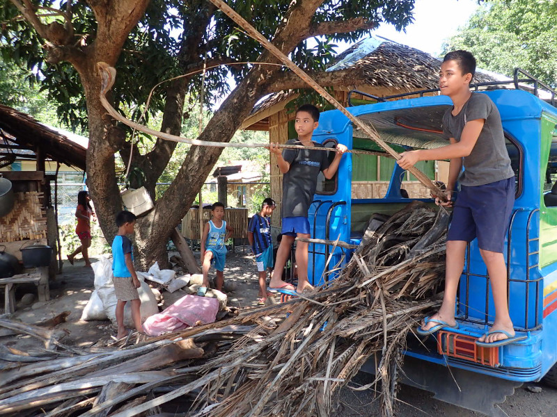 今日はこどもたちが山で薪にするヤシの枝を獲ってきましたよ。