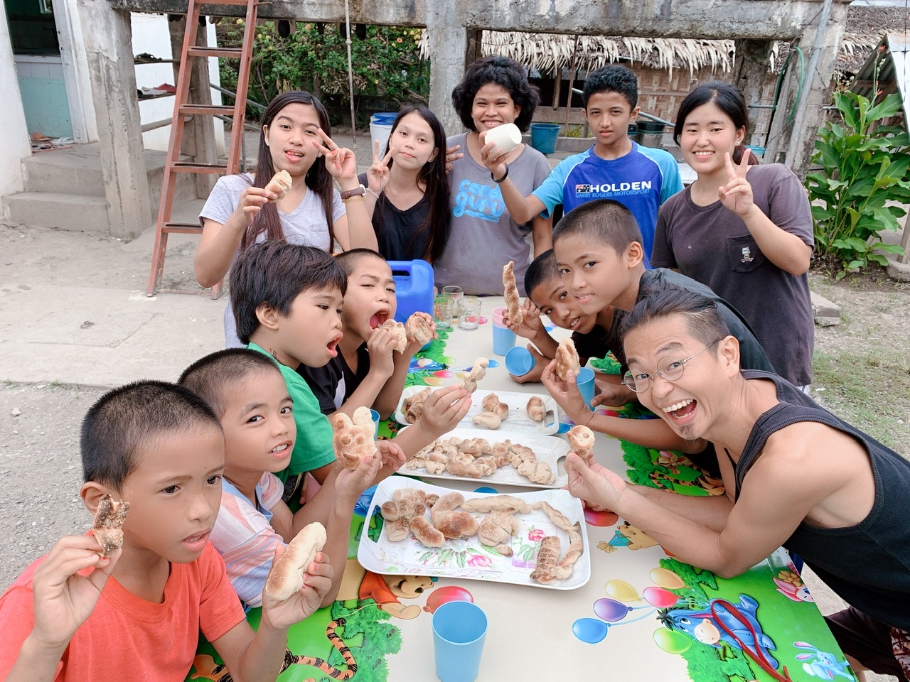 そんなこんなで出来上がったパンを、机を外に出して空の下でみんなで食べます。砂糖と塩をたっぷり入れたので、ビスケットの様な感じでパクパク食べれました。美味しかったなぁ。あつしさんが、頑張って作った子供たちようにジュースを差し入れしてくれました。ありがとうございます!