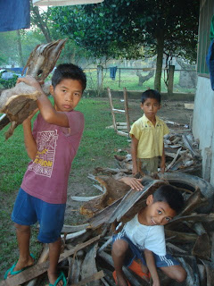ジェリコはナタを使って、ヤシの葉の茎を切って薪を作っています。