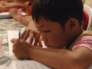 お次はちびっ子たち。やっているのはスタッフのジェーンがつくったワークシートです。