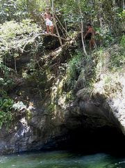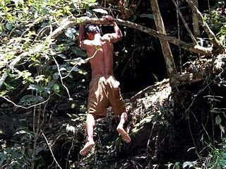 滝つぼに飛び込む途中で枝につかまり、戻ることも降りることのできなくなったアルソン。