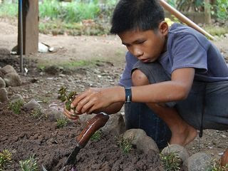 花壇の模様がえも順調に進んでいます。ジョネルが真剣な顔で花を植えています。