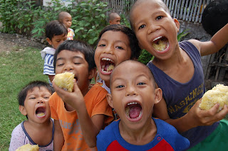 キャッサバとココナッツを使ったお菓子、「ポト」を頬張るこどもたち。