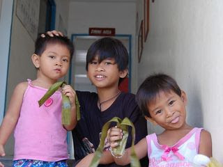 フィリピンの赤っぽい現地米をバナナの葉でくるんで蒸したお菓子をもって。