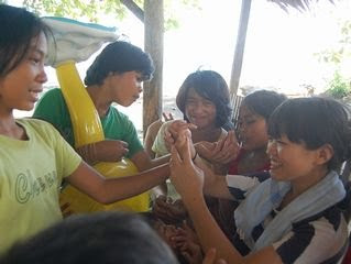 トモコの手相見が大好評で、女の子たちが群がっています。