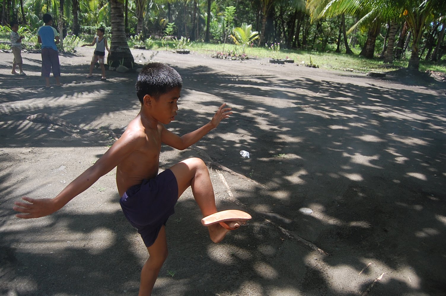 直接足で蹴ったら痛いので、サンダルを足の甲のほうに履いて遊びます。