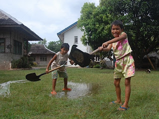 雨上がりにインダイとジョアンが、庭の水かきをしています。
