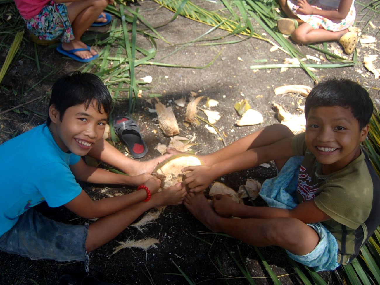 ロサガマイとミッチーがヤシの実を2人がかりでこじあけようとしています。