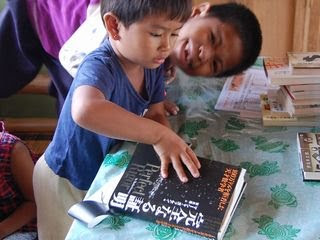 私が日本から買って帰った本や楽器に群がるこどもたち。