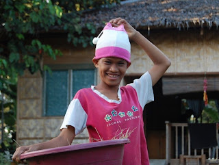 実家の誰かからもらってきた帽子をうれしそうにかぶるローサ。洗濯桶が似合いますね。