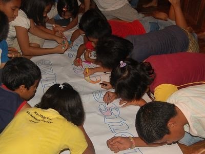 みんなで「Welcome to House of Joy」と書いてバナーをつくりました。