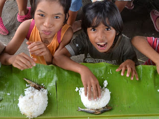 朝食は朝どり野菜と、焚火で炊いたごはんです。皿の代わりはバナナの葉っぱ。