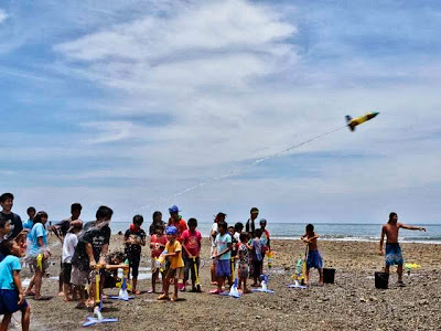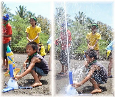 昨晩つくったロケットに水を入れてから発射台に載せ、ポンプで空気を送り込んで…発射!