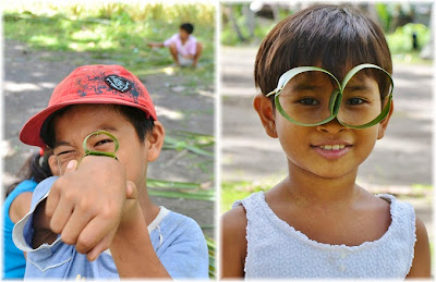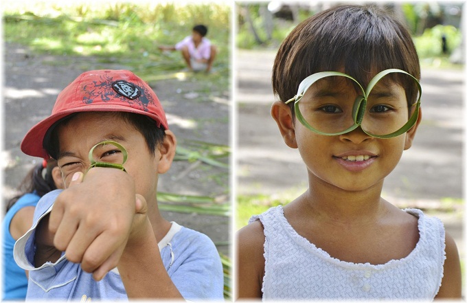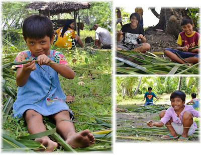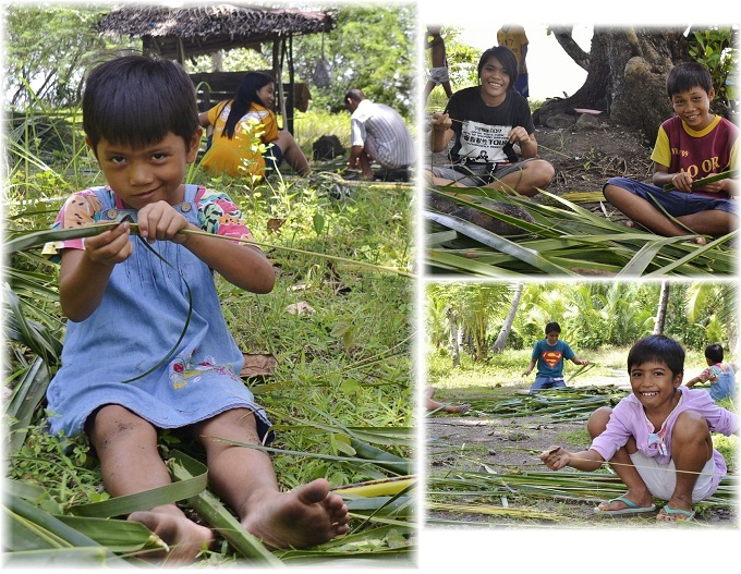 早速とってきたヤシの葉っぱでほうき作り開始です。