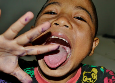 ボールペンのインクがもれて「手が汚れたー!!舐めてとるー!!」とのこと。