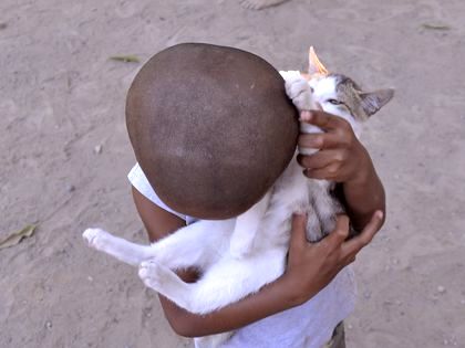 この写真、ネコのお腹に押し付けているのは鼻でしょうか、右頬でしょうか、左頬でしょうか?(笑)