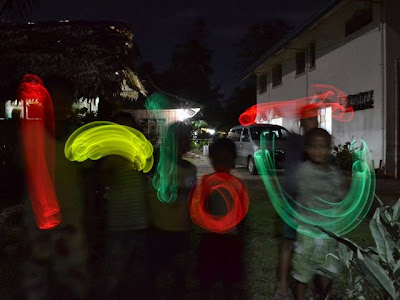 シャッタースピードを遅くして、残像でつくった「HOJ」。ちびっ子たちにしてはいい出来ですよね?